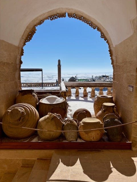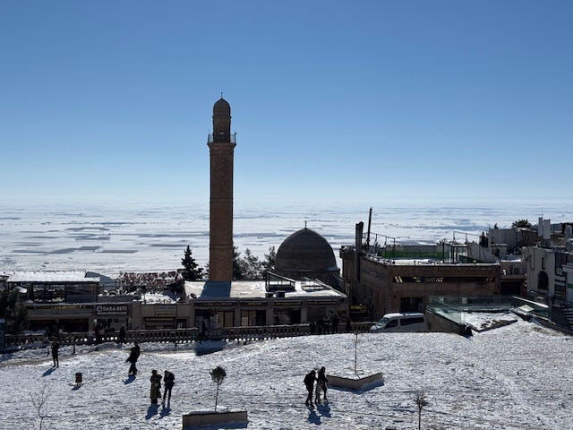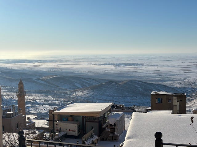 I am writing this from a snowed in yellow limestone cliff house in Mardin’s Old City. The landlord says the house is as old as the city’s Grand Mosque, which was built in the 12th century. A historian friend tells me that it must be Medieval, probably from the 14th-16th centuries. The kitchen window overlooks the vast Mesopotamian plains. In the near distance, about 20 km away, is the border with Syria. Snow has been falling here since Monday, and getting up and down the hill, with its steep, smooth stairs covered in heavy snow and patches of dark ice, has become a bit of an extreme sport. Most restaurants in the sloping Old City are closed or operating with kitchens at reduced capacity, even on New Year’s Eve. You can order French fries or gözleme, but you will have to risk life and limb on the staircase-slopes if you want to get anything greener than that. All the same, I have no complaints. Mardin is exquisite, one of the most beautiful places I’ve ever seen.