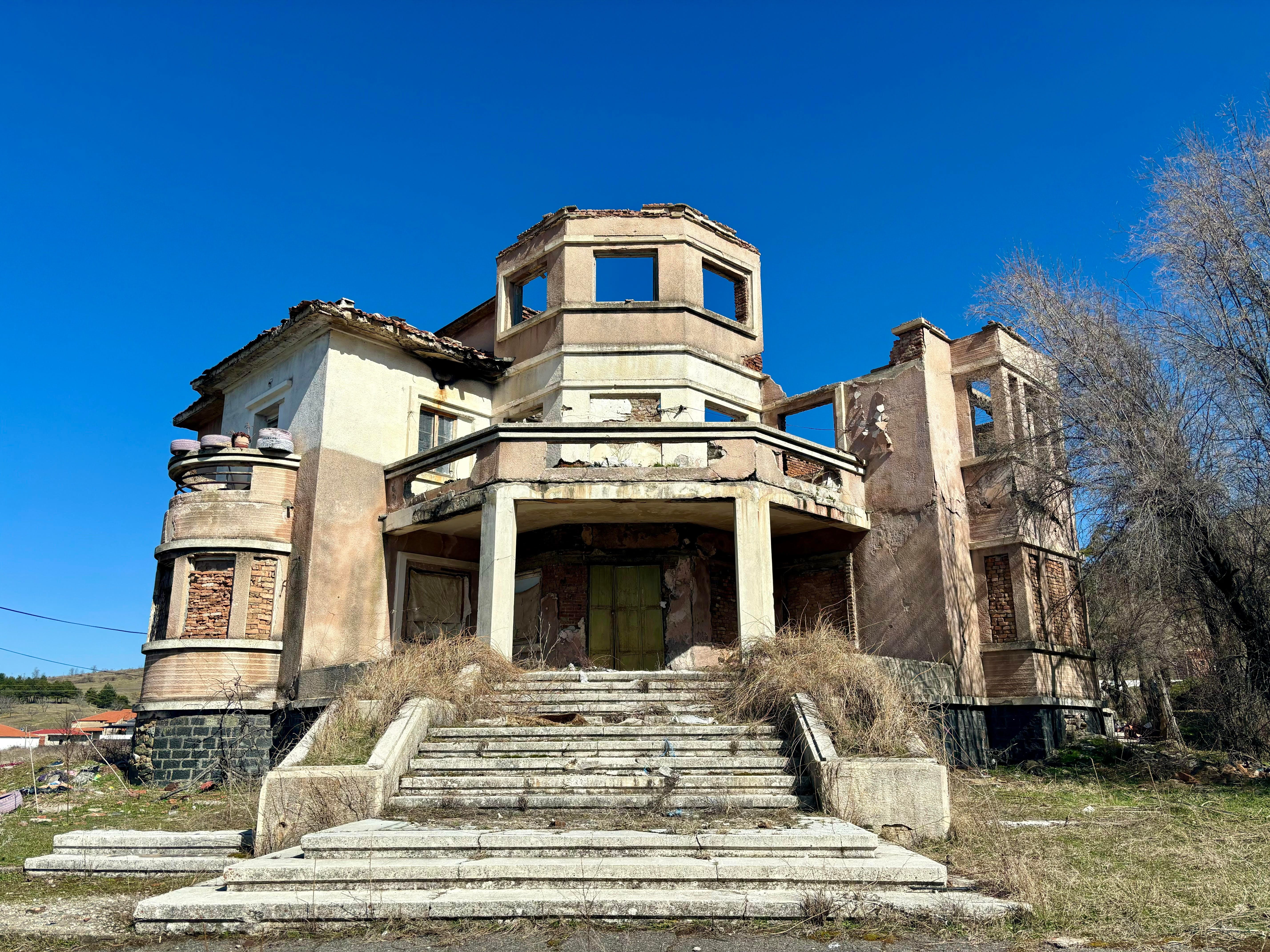 I commenced my bannedthought.net binge trying to find information about something else that seemed relegated to the realm of secret knowledge: the spectral remains of the old factory on the edge of town. I stumbled on it one morning by accident, and it left me with a haunted feeling that refused to leave me. One day in early March, I wandered a few kilometers up the Bulevardi Fan Noli, a street named after the Albanian national hero and founder of the Albanian Orthodox Church. I walked past the century-old Korça Brewery, which makes beer from the waters that flow from Morava Mountain. Just beyond the brewery on my left, I saw a boundless yellow field open up which let me know that I had reached the edge of town. Set very far off the road, deep within that field, was an abandoned villa. It stood completely alone. Grand and palatial, even in its reduced, decayed form, it seemed very out of place. Its aura was forbidding, and I approached it with caution. Up close, it was even more extraordinary: three stories tall, with a stately entrance and multiple balconies. Most of its windows had been boarded up with bricks. Though thoroughly abandoned, it looked like something that had been preserved due to superstition. Clearly someone important had lived in it once.